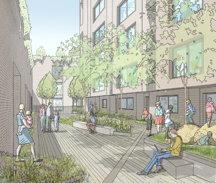 At the heart of the scheme is an open courtyard which takes precedent from the nearby Allens Gardens and provides an inviting, safe space for resident families, achieves the urban greening factor and promotes biodiversity through private amenity and play space.