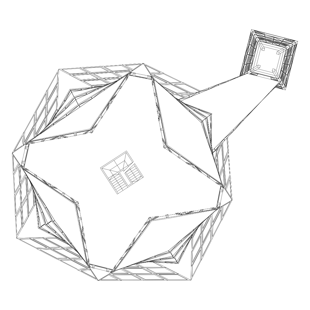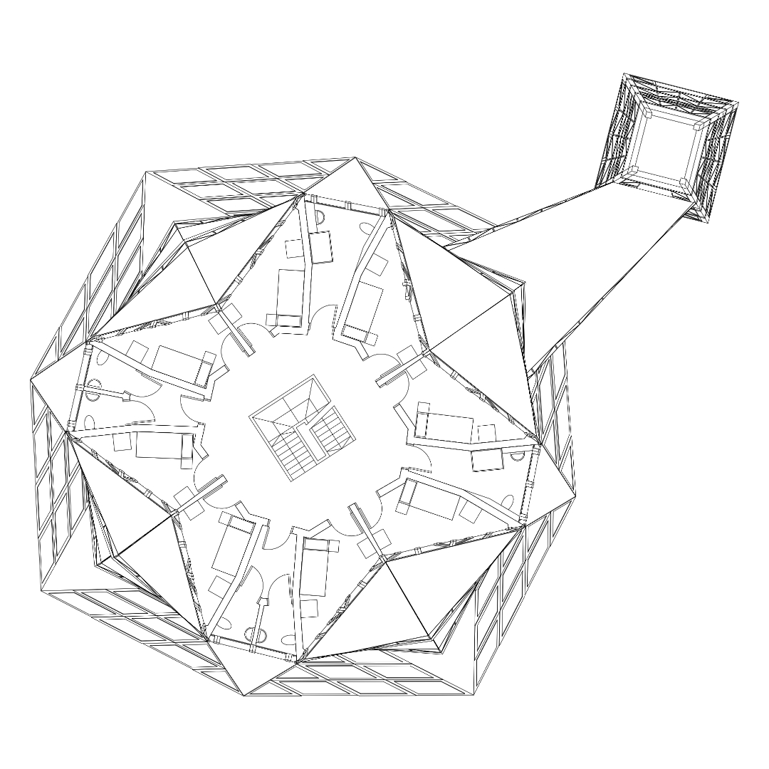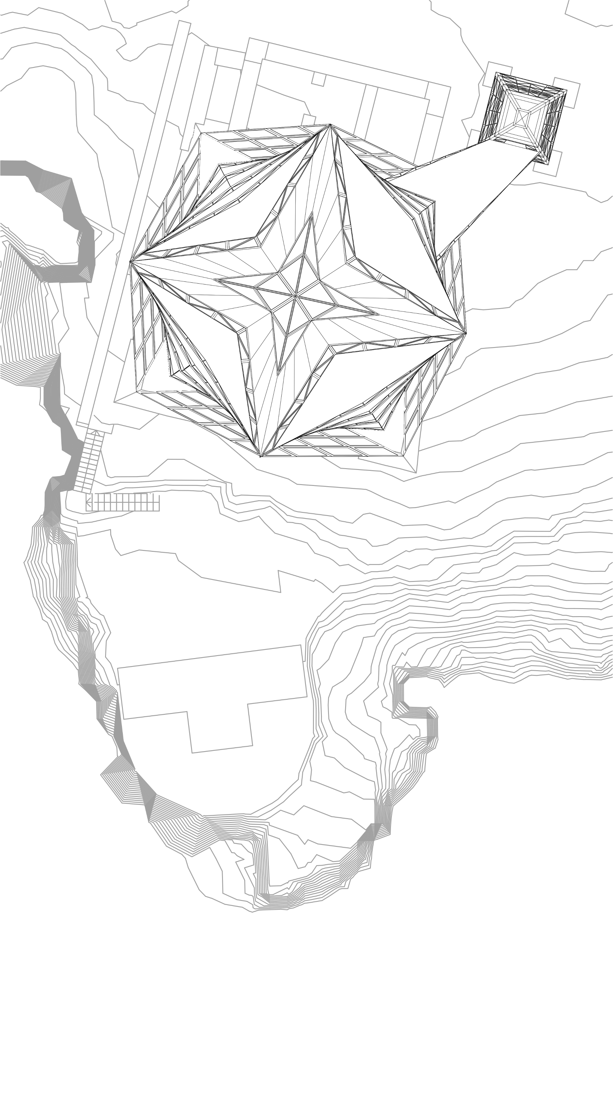 A precision sculpted silhouette rises from the existing stone base taking the form of a lantern, containing accommodation for up to 16 artists with shared bathroom facilities and a communal kitchen, bar and lobby on the ground floor. A structural glass floor provides visual connectivity to the existing stone ruin below that is left preserved and untouched.