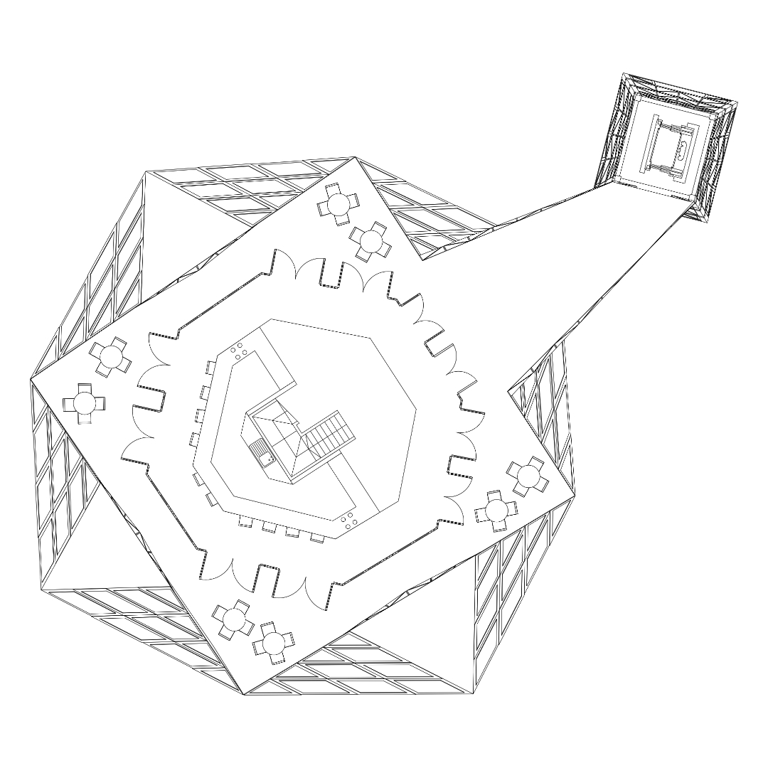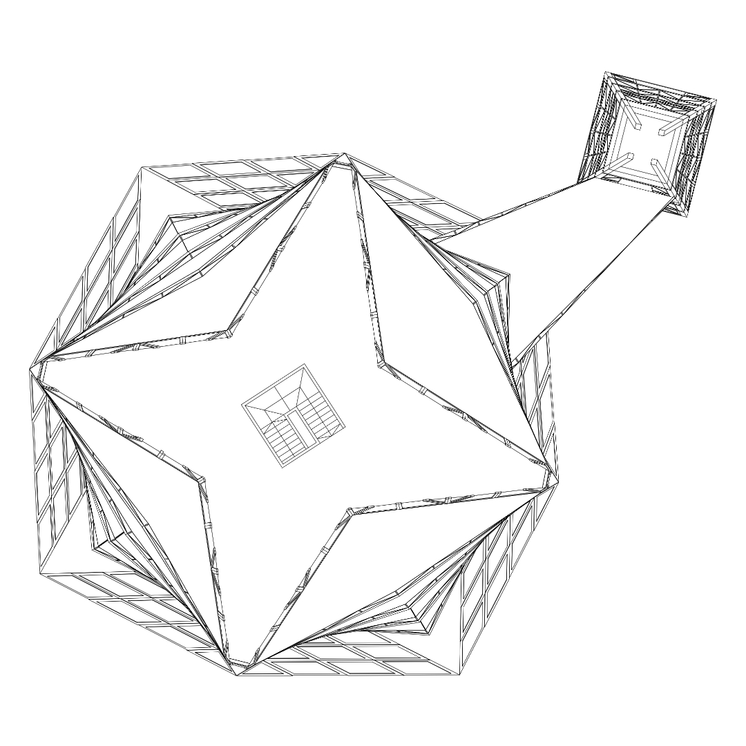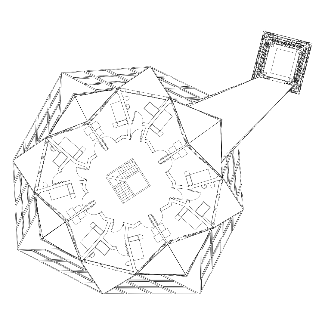 A precision sculpted silhouette rises from the existing stone base taking the form of a lantern, containing accommodation for up to 16 artists with shared bathroom facilities and a communal kitchen, bar and lobby on the ground floor. A structural glass floor provides visual connectivity to the existing stone ruin below that is left preserved and untouched.