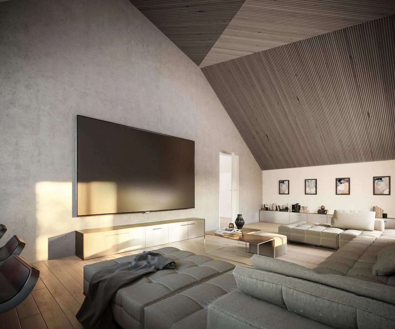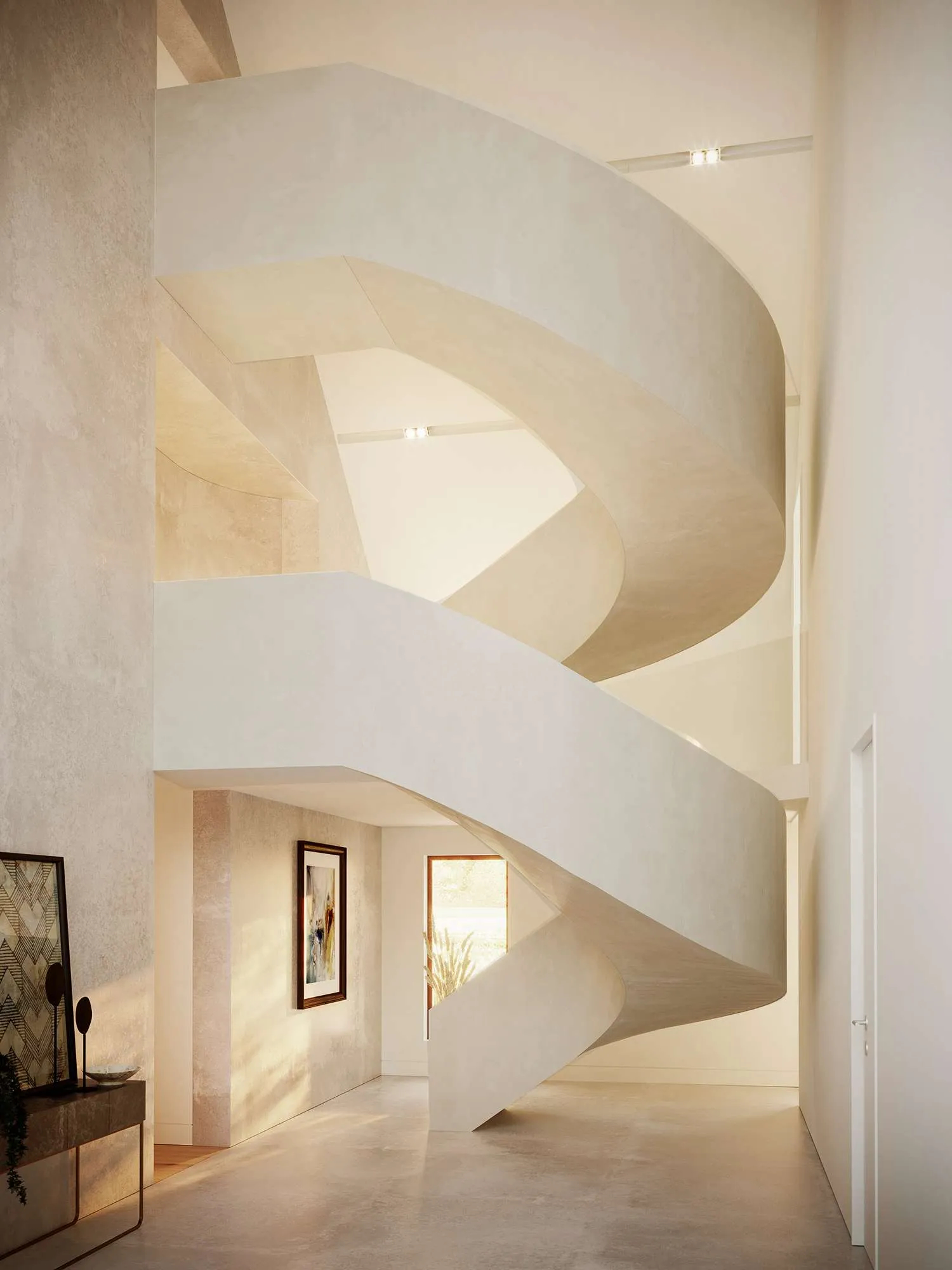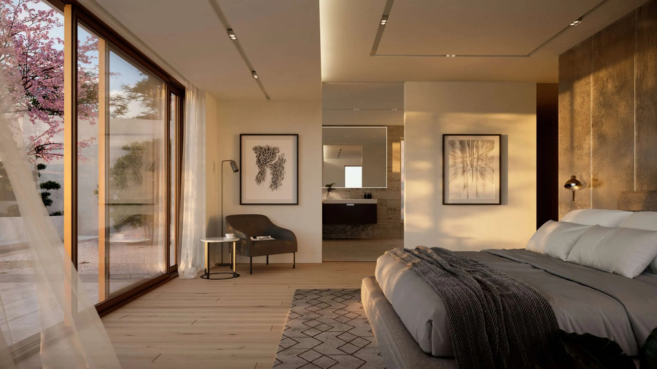 To utilise the views and the site’s southern aspect, the main living spaces have been located at first floor, which includes a large cinema and entertainment room to the eastern wing and an expansive open-plan living space and west facing balcony overlooking the garden, along with an adjoining dining room and utility spaces. A series of bedroom suites are located at ground floor, including a large master bedroom with direct access to the garden.