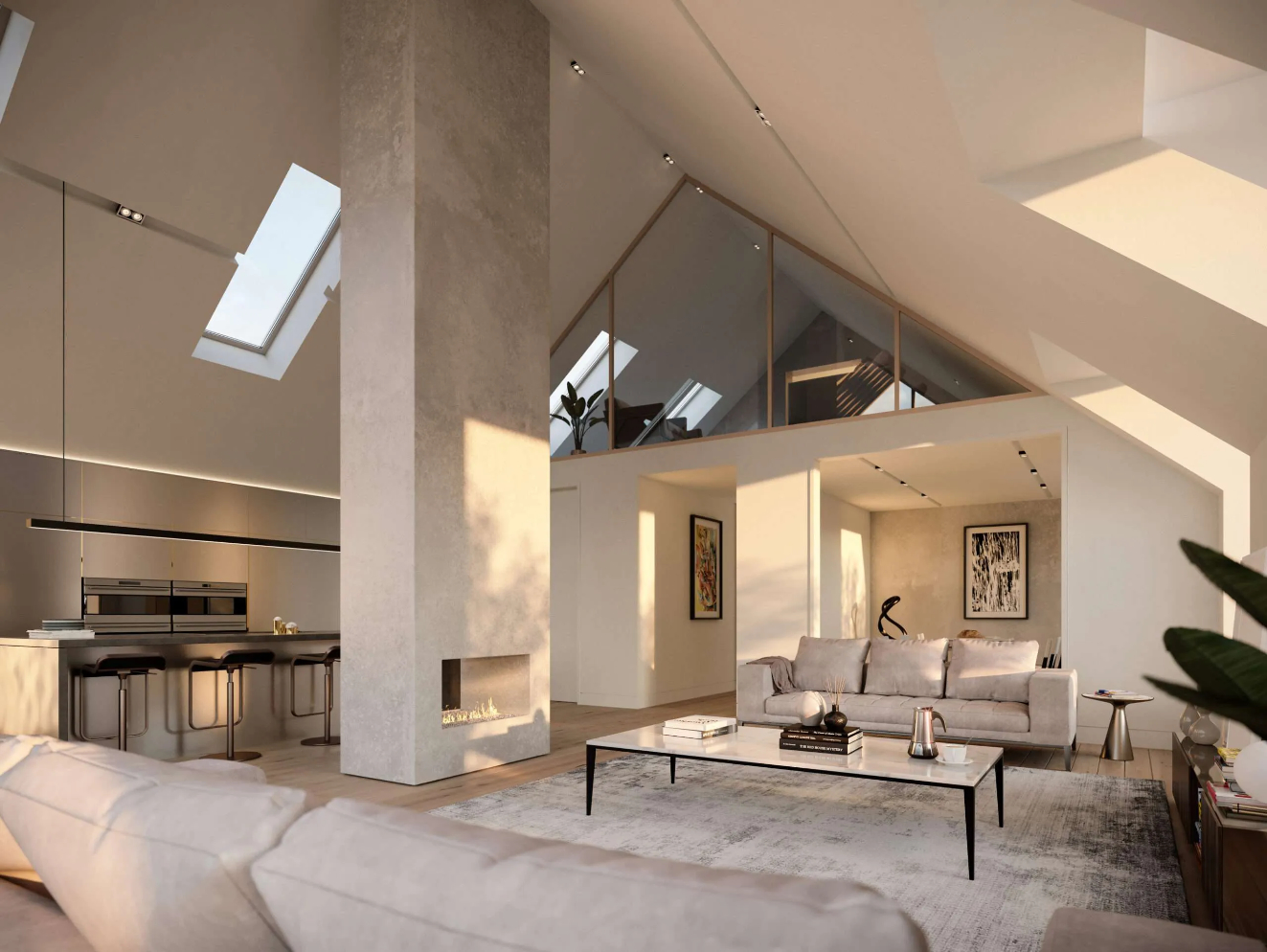 The concept for the house was a contemporary take on traditional barns that informed the building’s strong massing and gable form. Set out on a uniform grid, the layout of the house is arranged over three floors with a partial mezzanine in the roof space. The double height entrance acts as a natural divider with a series of generous gallery walkways that connect the living spaces and offer key views across the landscape.